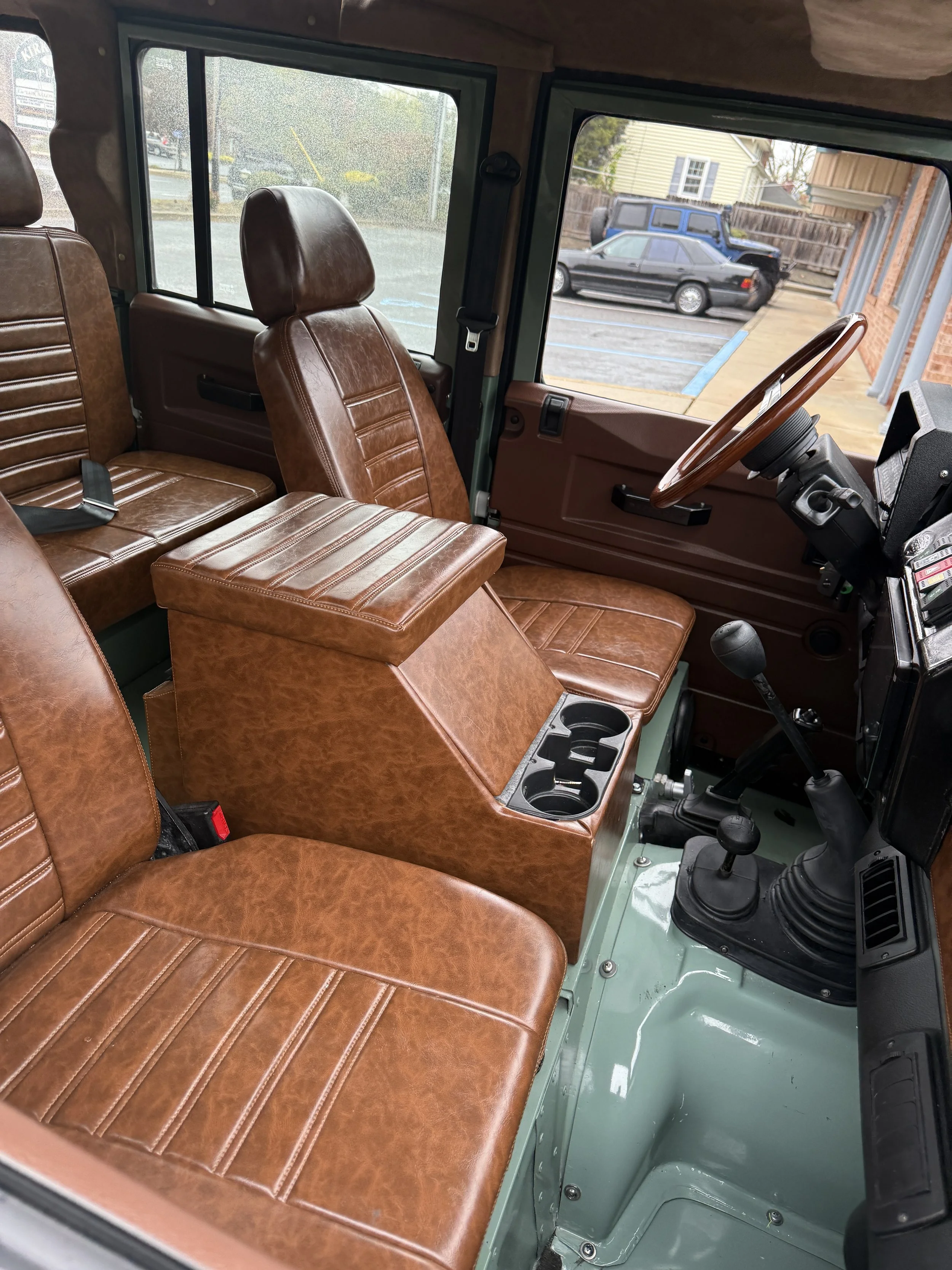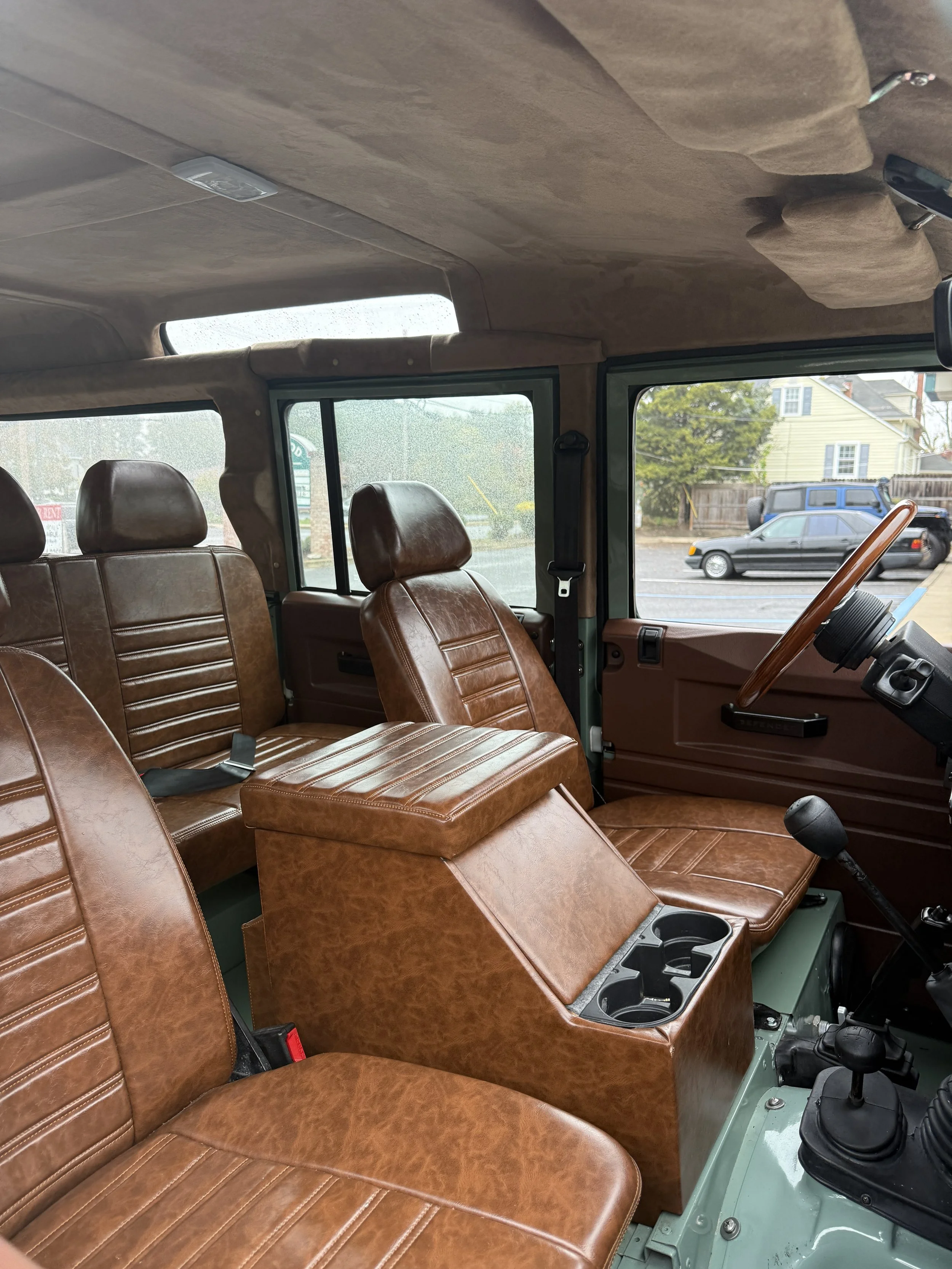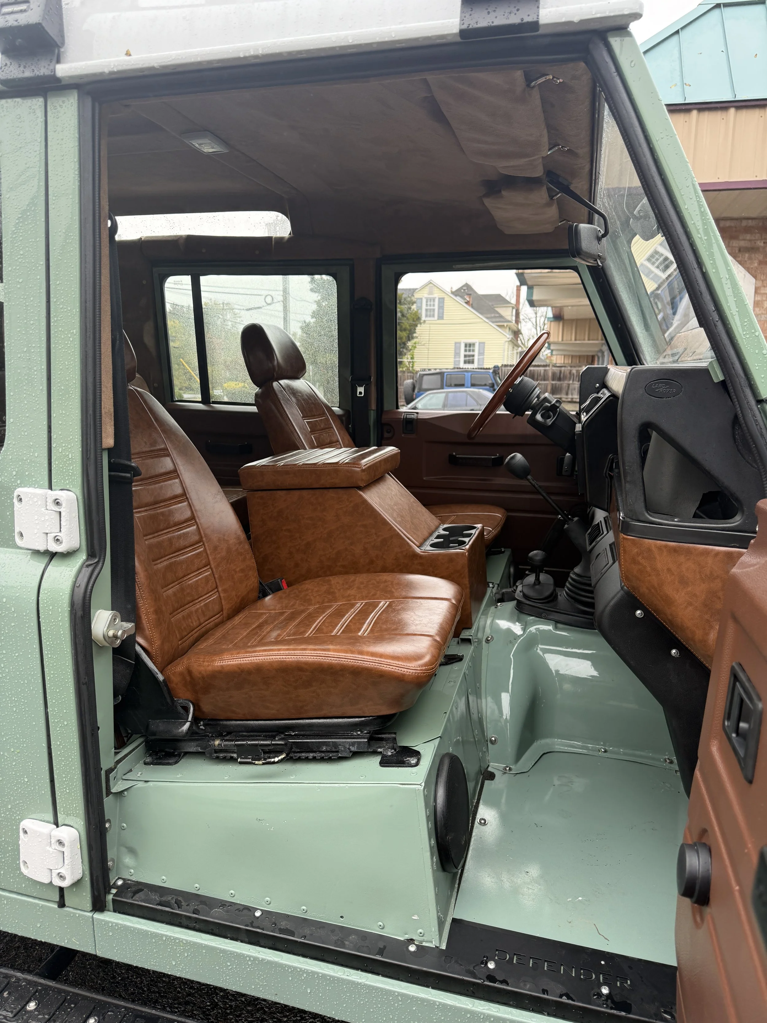 The interior has been reupholstered in chestnut brown leather, the interior still smells like a new car! The interior features power locks, and an air conditioning unit. The new steering wheel, saddle brown leather, and modern creature comforts make this Defender a true pleasure to drive!