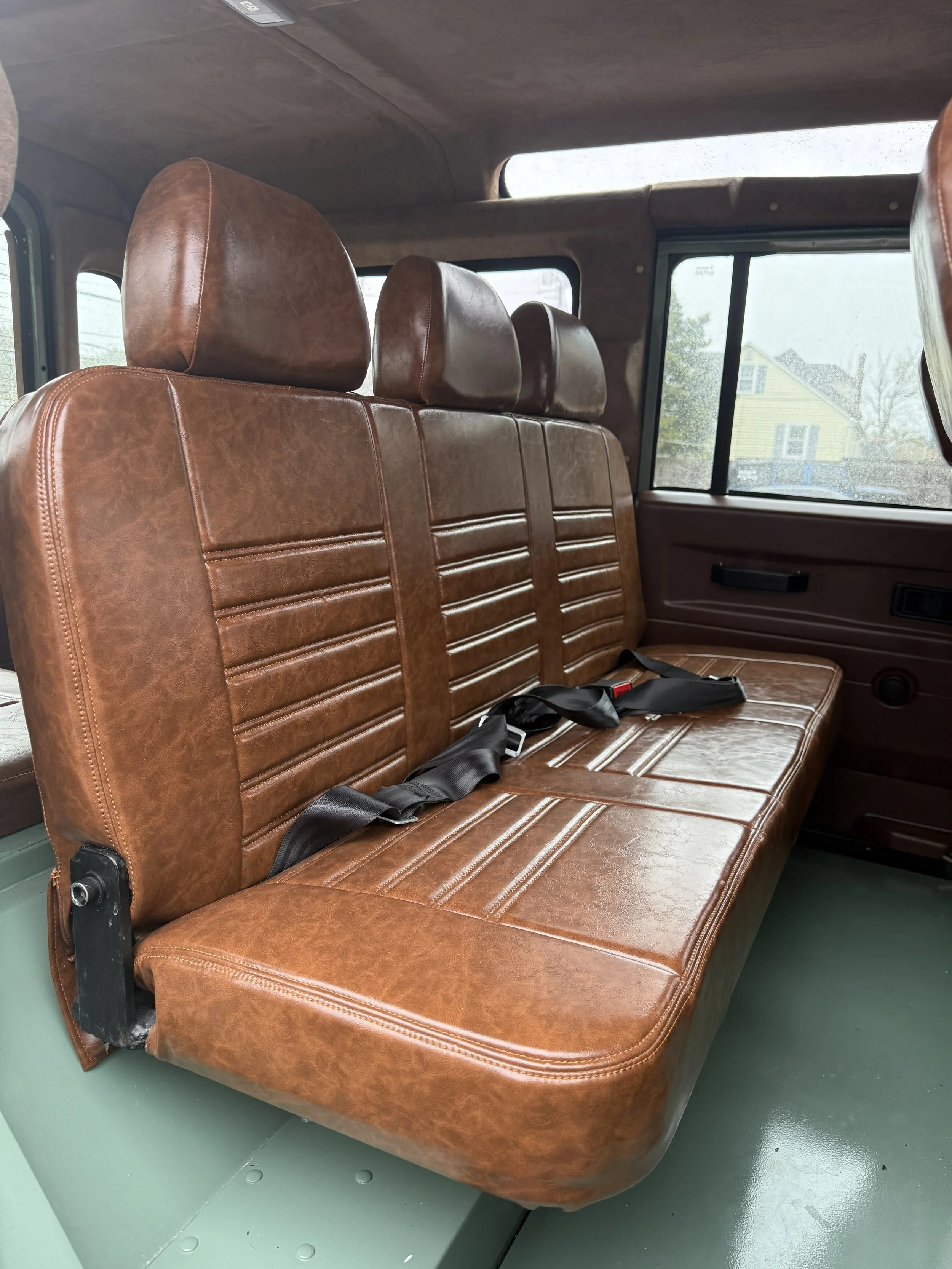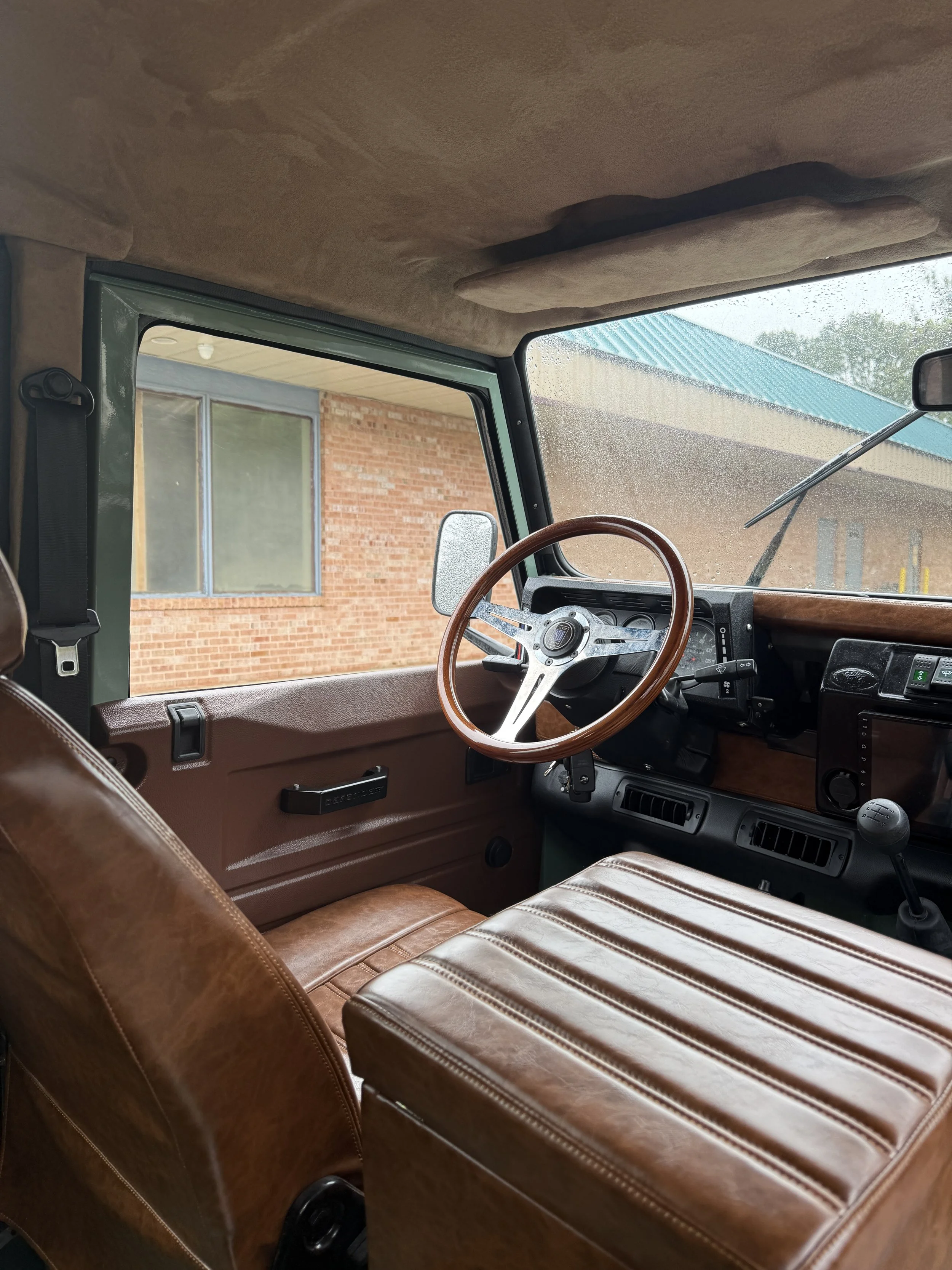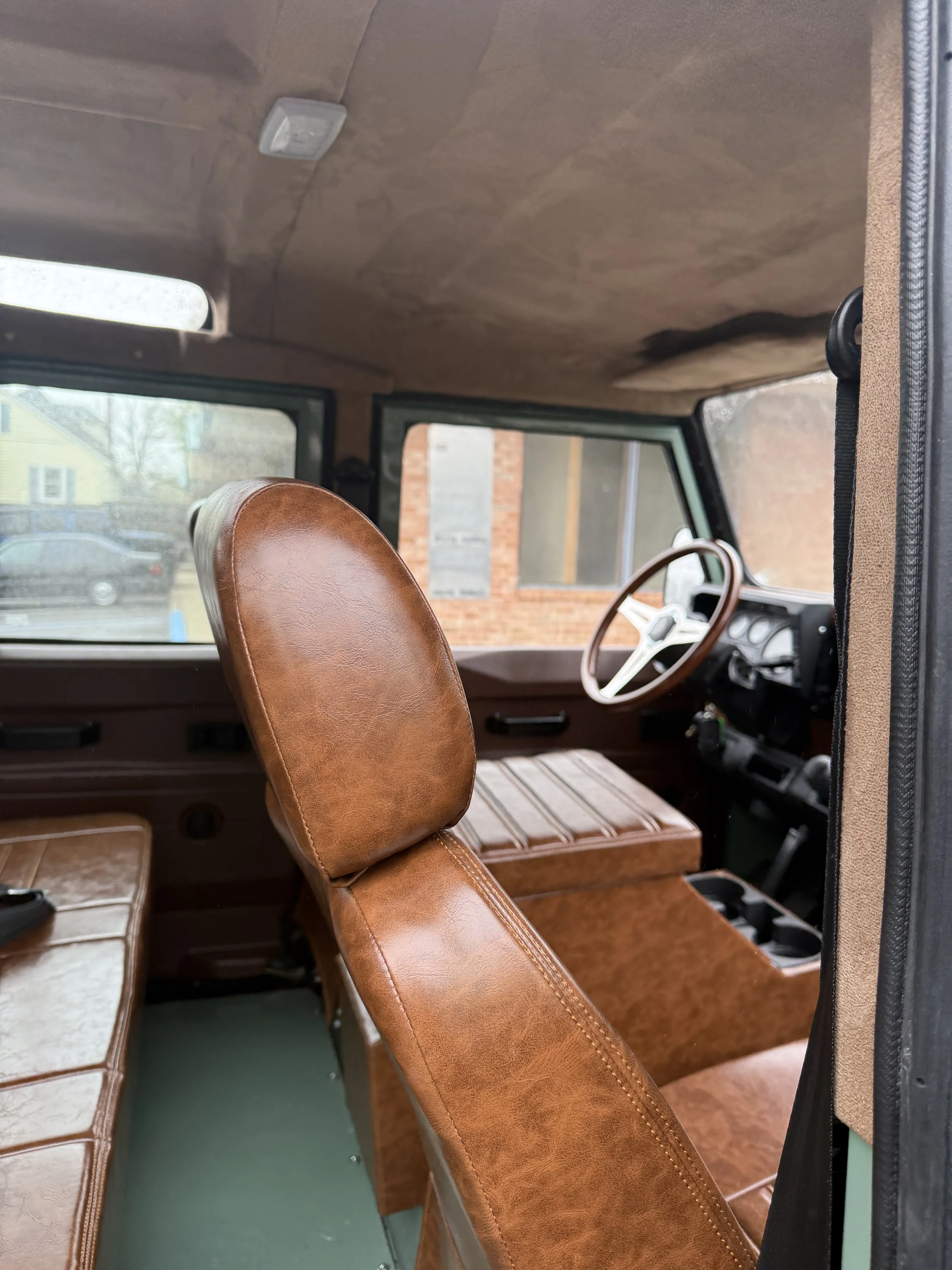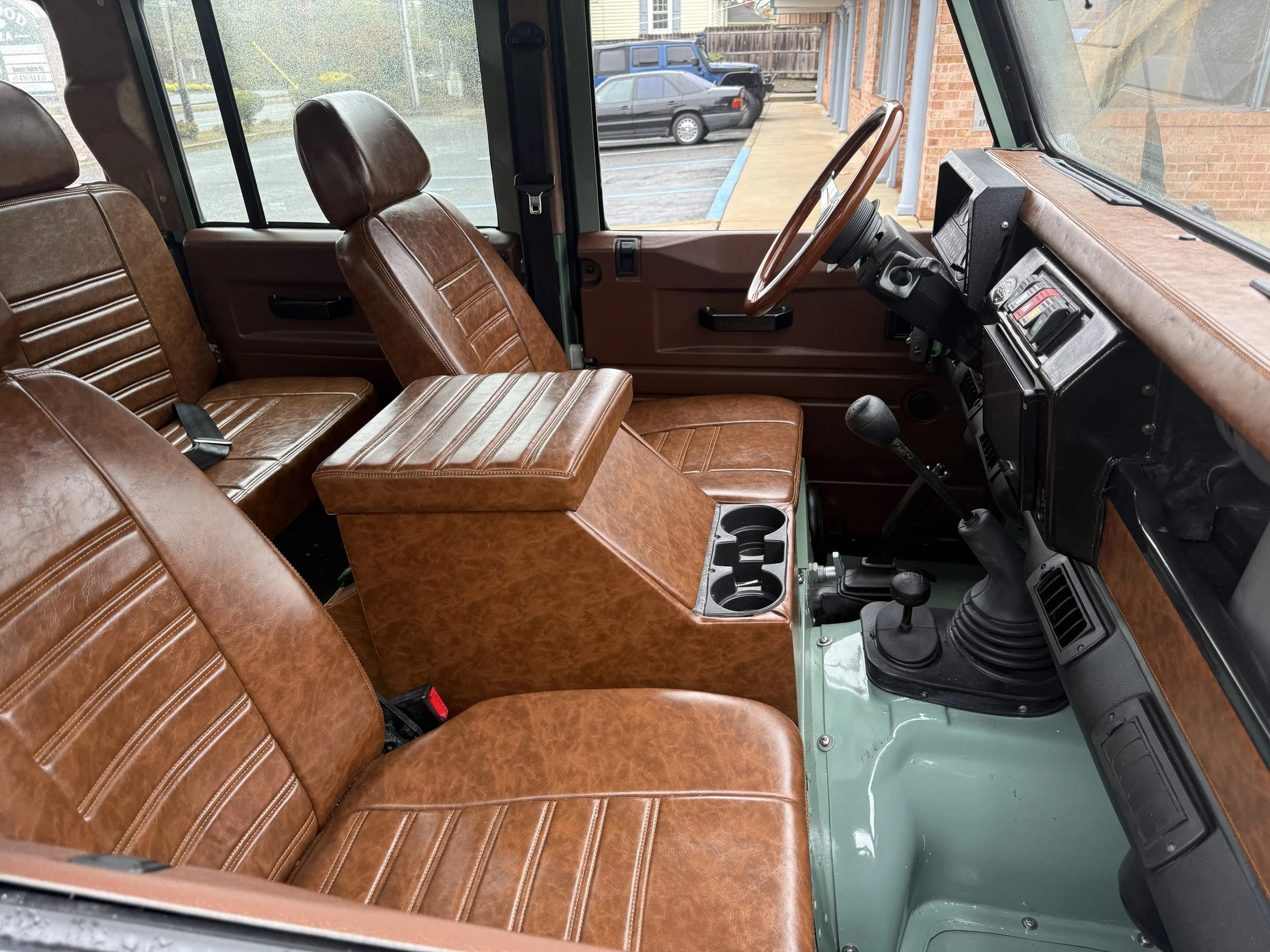 The interior has been reupholstered in chestnut brown leather, the interior still smells like a new car! The interior features power locks, and an air conditioning unit. The new steering wheel, saddle brown leather, and modern creature comforts make this Defender a true pleasure to drive!