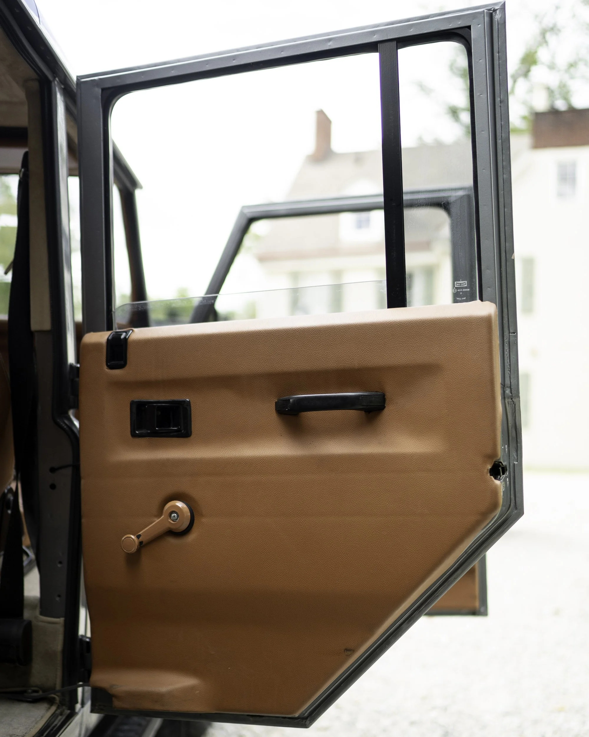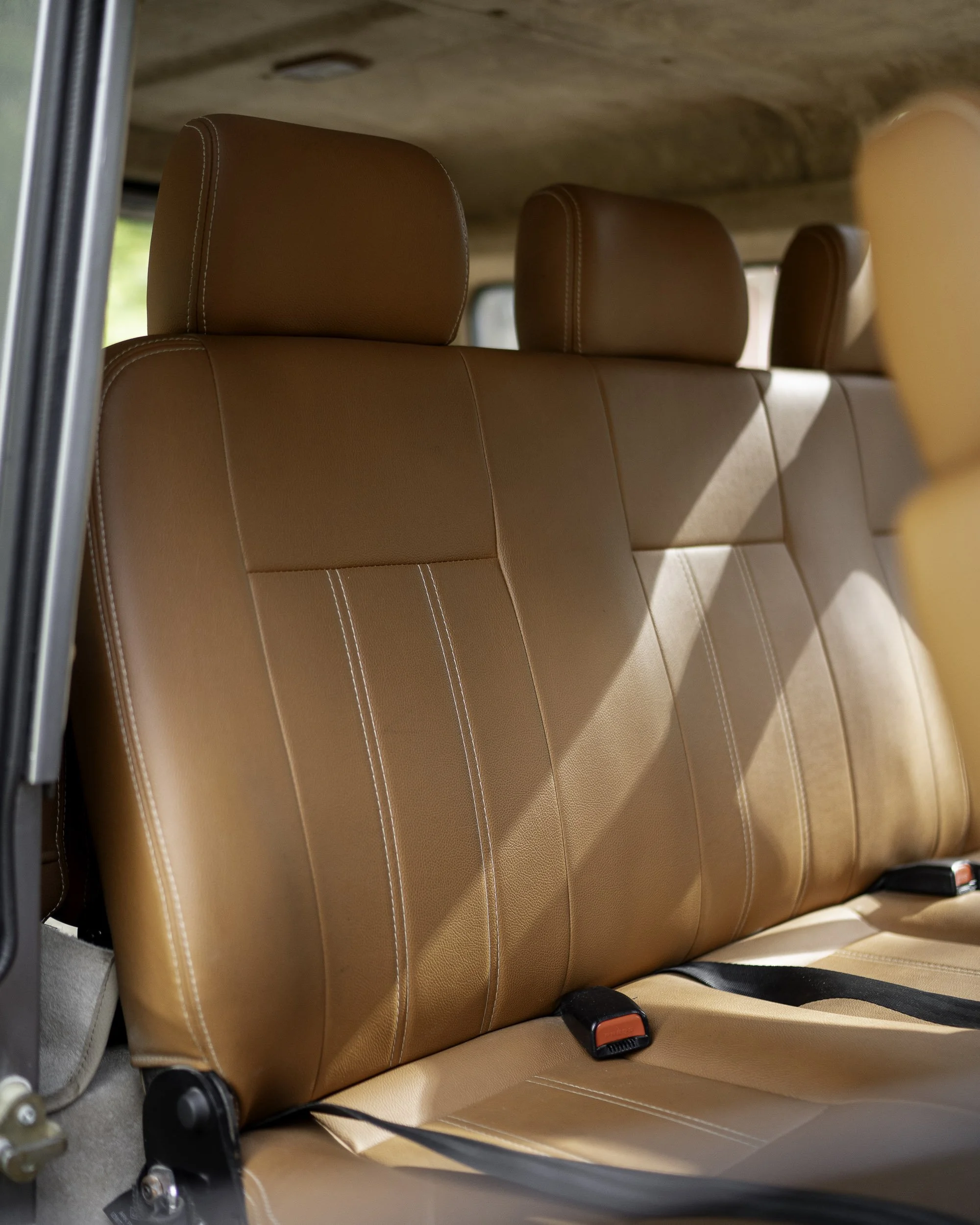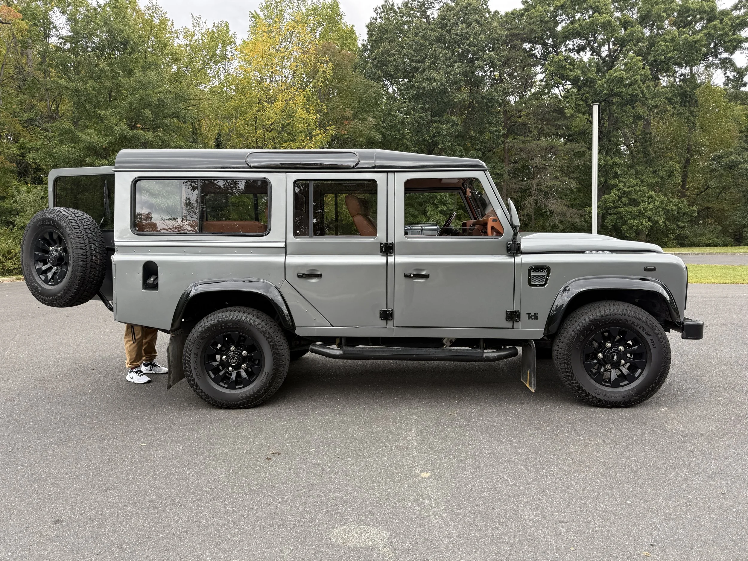 This Land Rover Defender is a very classic style refurbishment which has been repainted in gunmetal Gray and upgraded with new caramel brown leather upholstery, and a 300 TDI engine and 5 speed transmission.