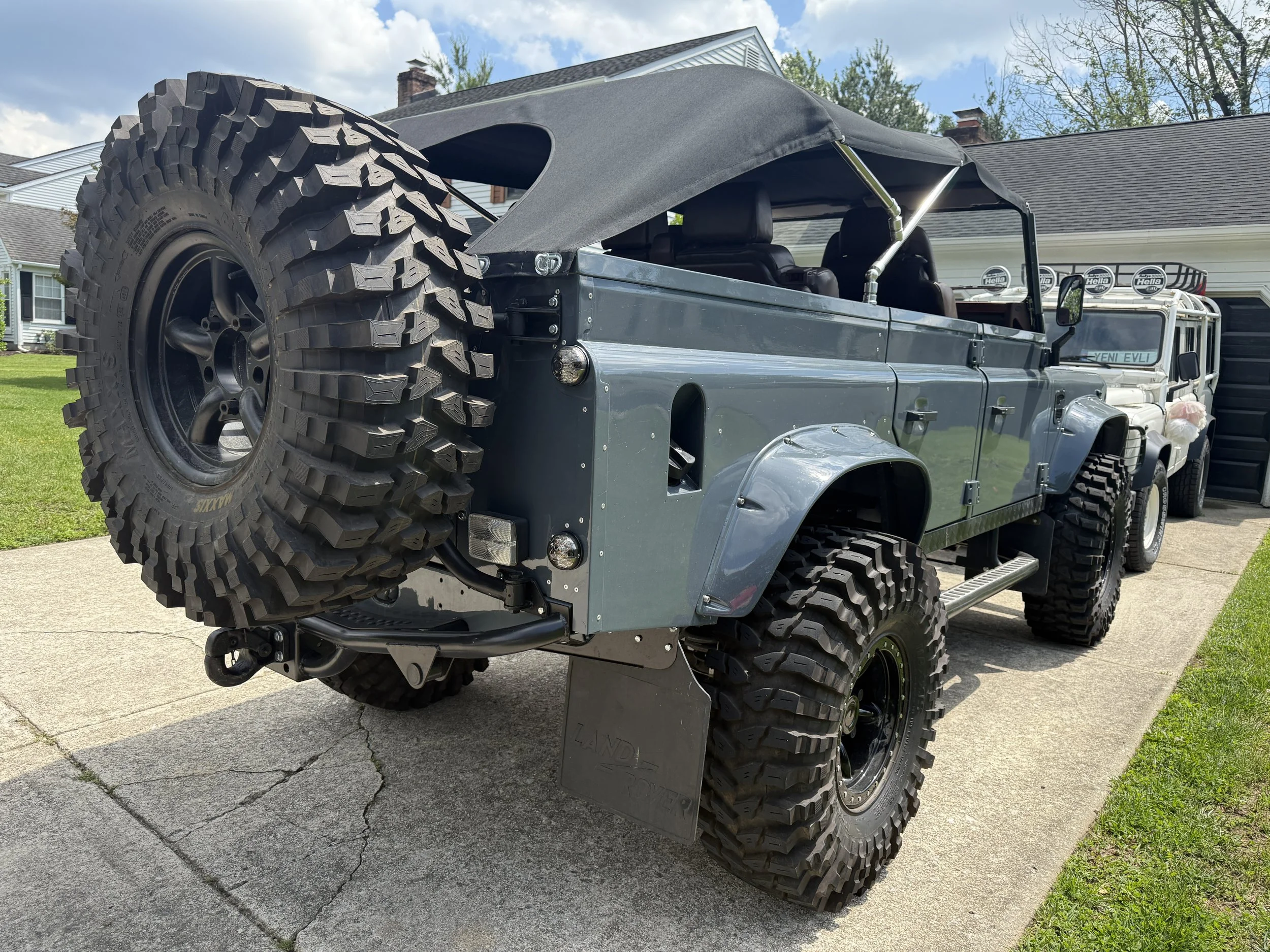 The aluminum body has been repainted in Porsche Graphite Gray. The Defender is fitted with larger flares, beadlock wheels, and oversized tires and a custom body.