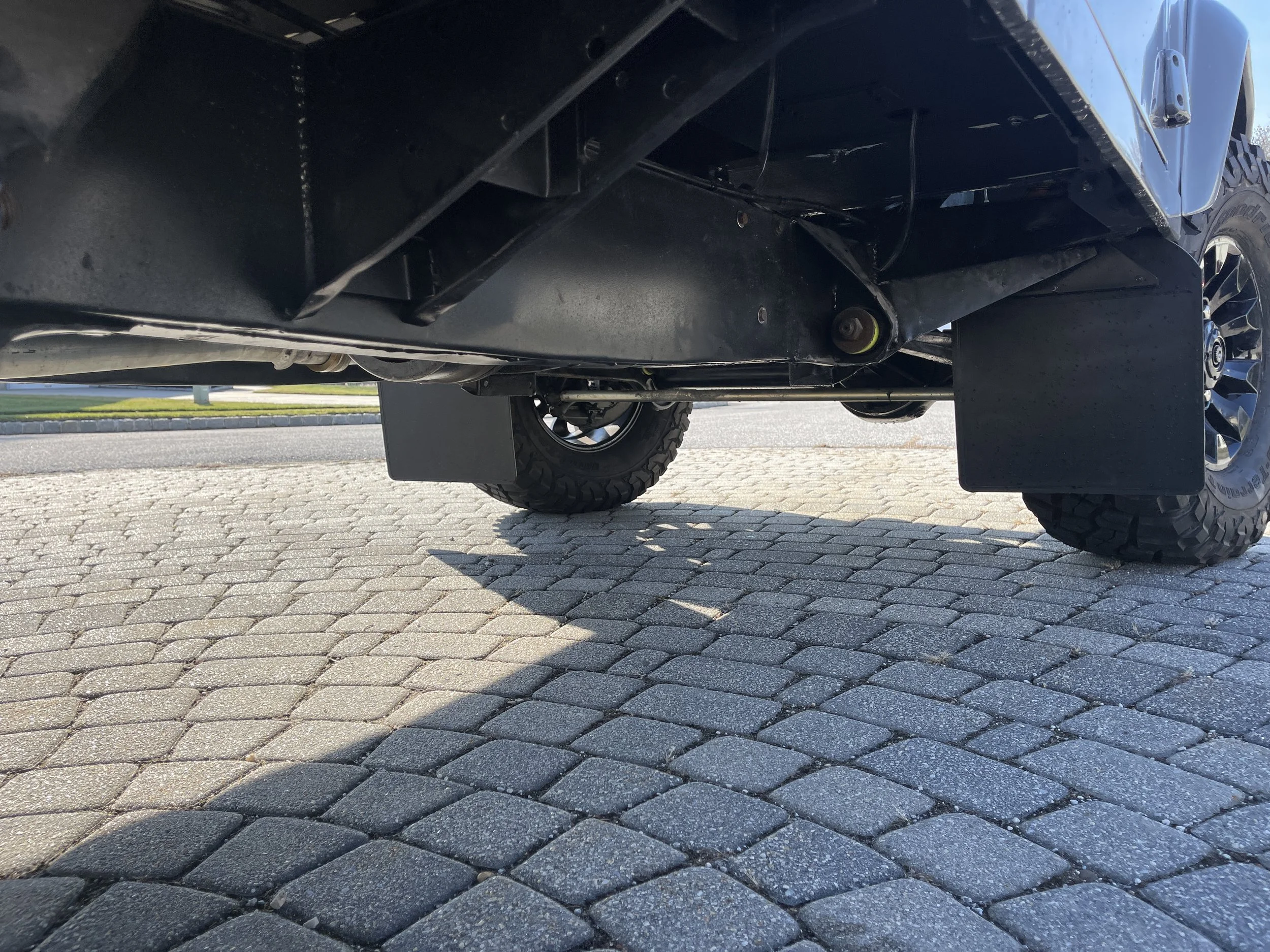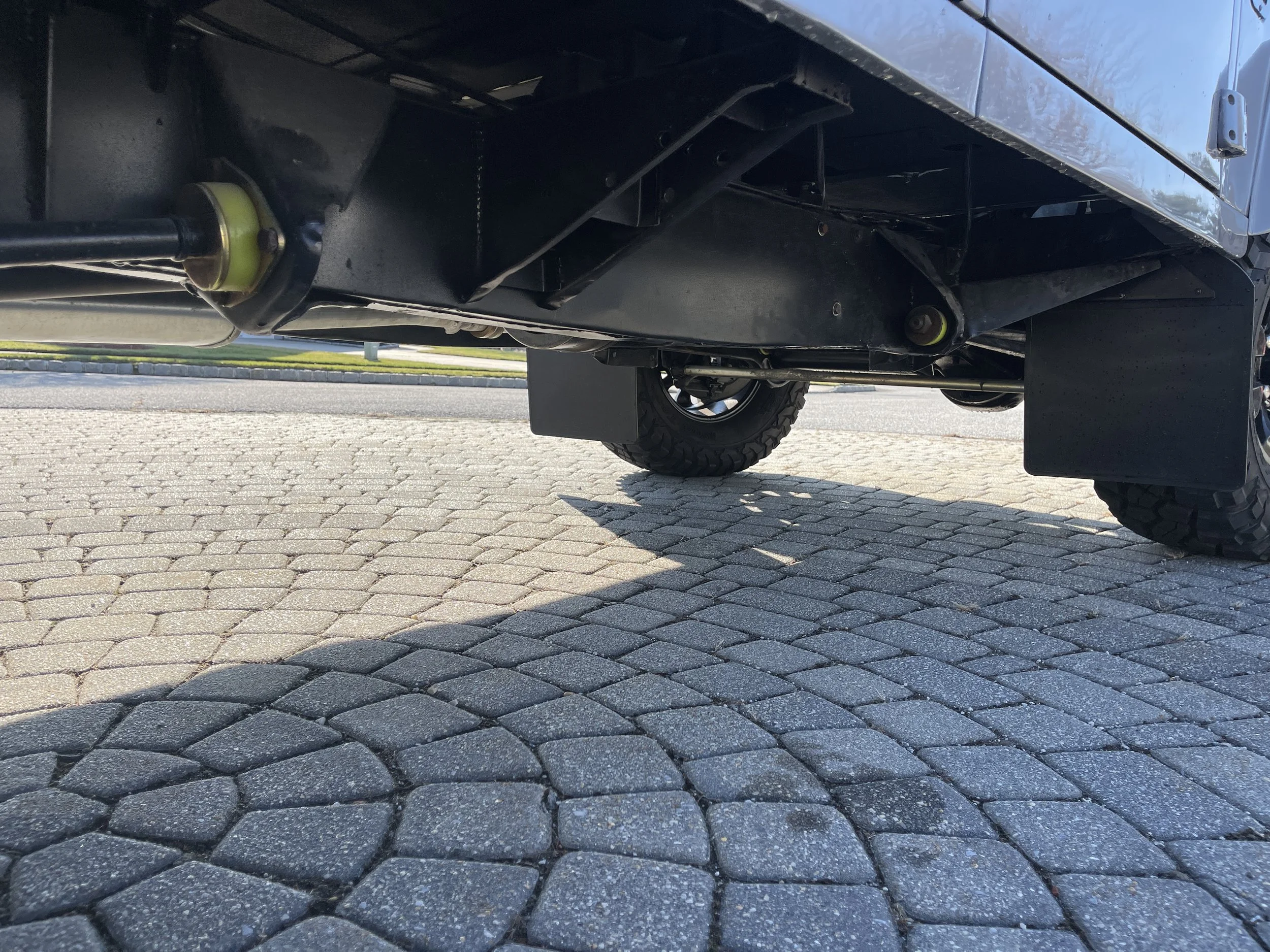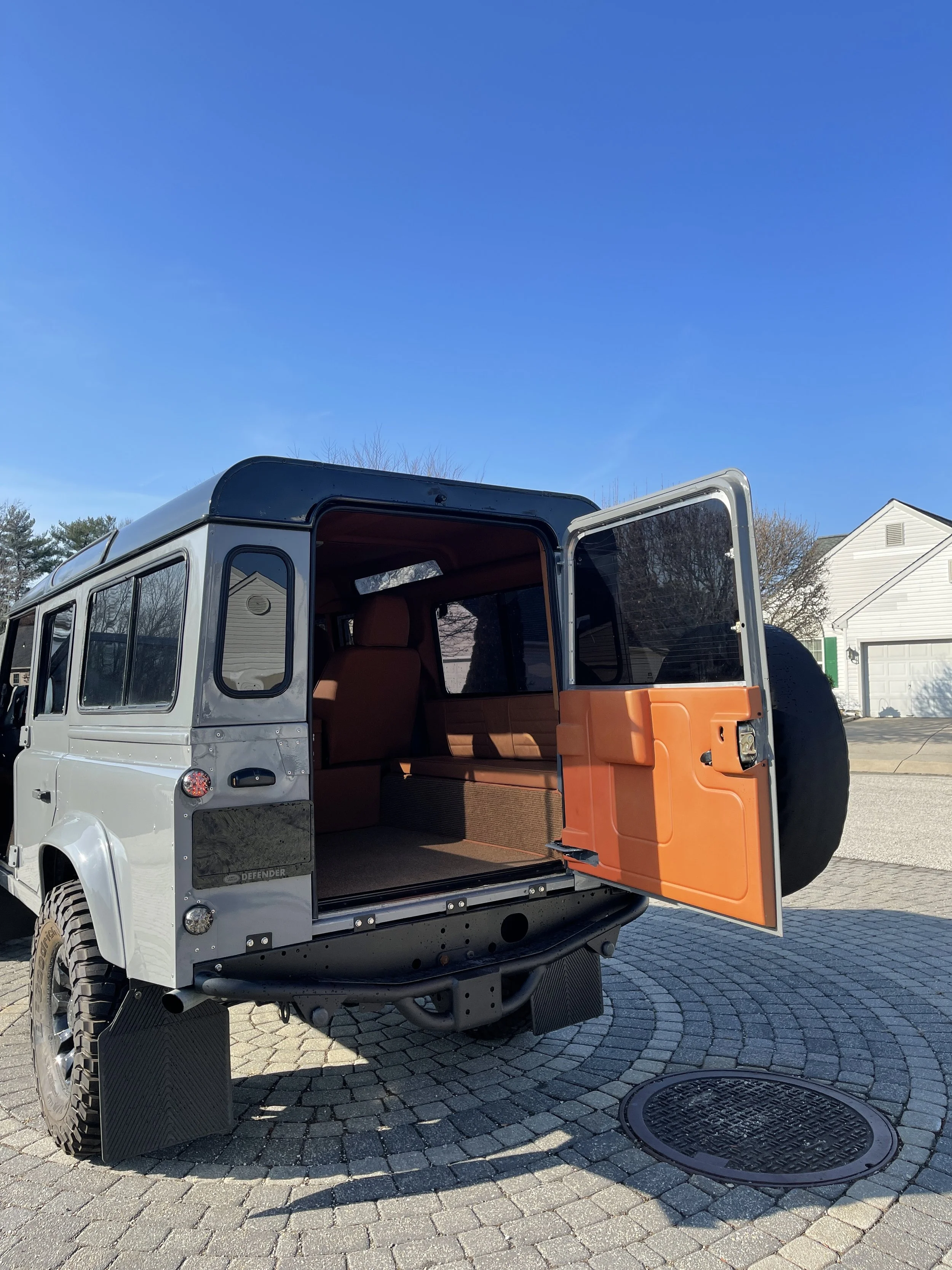 The aluminum body was taken apart and new body panels were ordered in order to guarantee a flawless paint finish. The Defender has been repainted in Nardo Gray and upgraded with larger wheels and tires, and a front A Bar, along with an upgraded rear bumper.